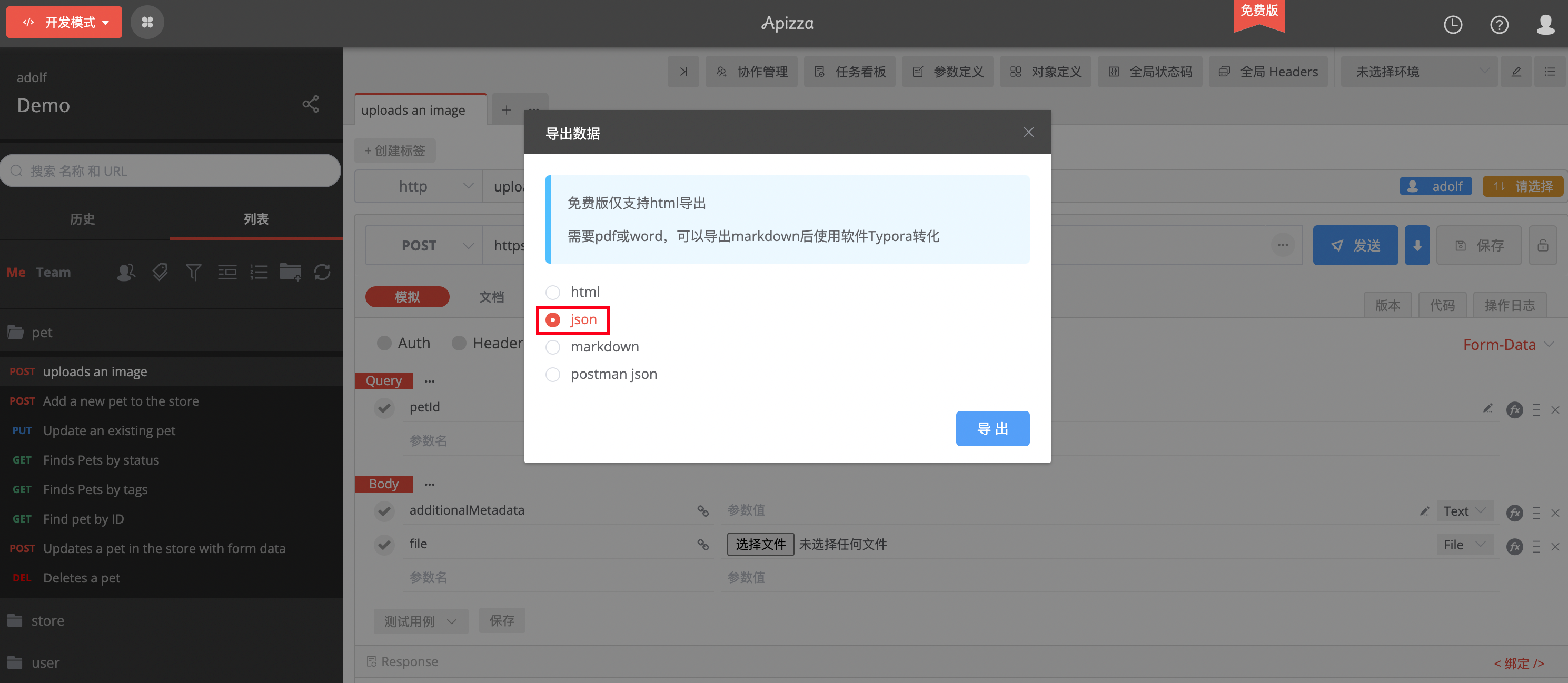 导入 / 导出接口导入接口导入 Apizza本页总览导入 Apizza支持导入 Apizza 中的 json 文件,有关于 Apizza 产品的详情说明请参考项目地址。导出数据访问 Apizza,在“开发模式”下,点击右侧的“圆形花状”按钮,轻点菜单下拉栏的“导出”选项。选择导出为 json 格式。导入数据打开 Apifox 中的“项目设置”面板,选择 Apizza,上传已导出的 json 文件。