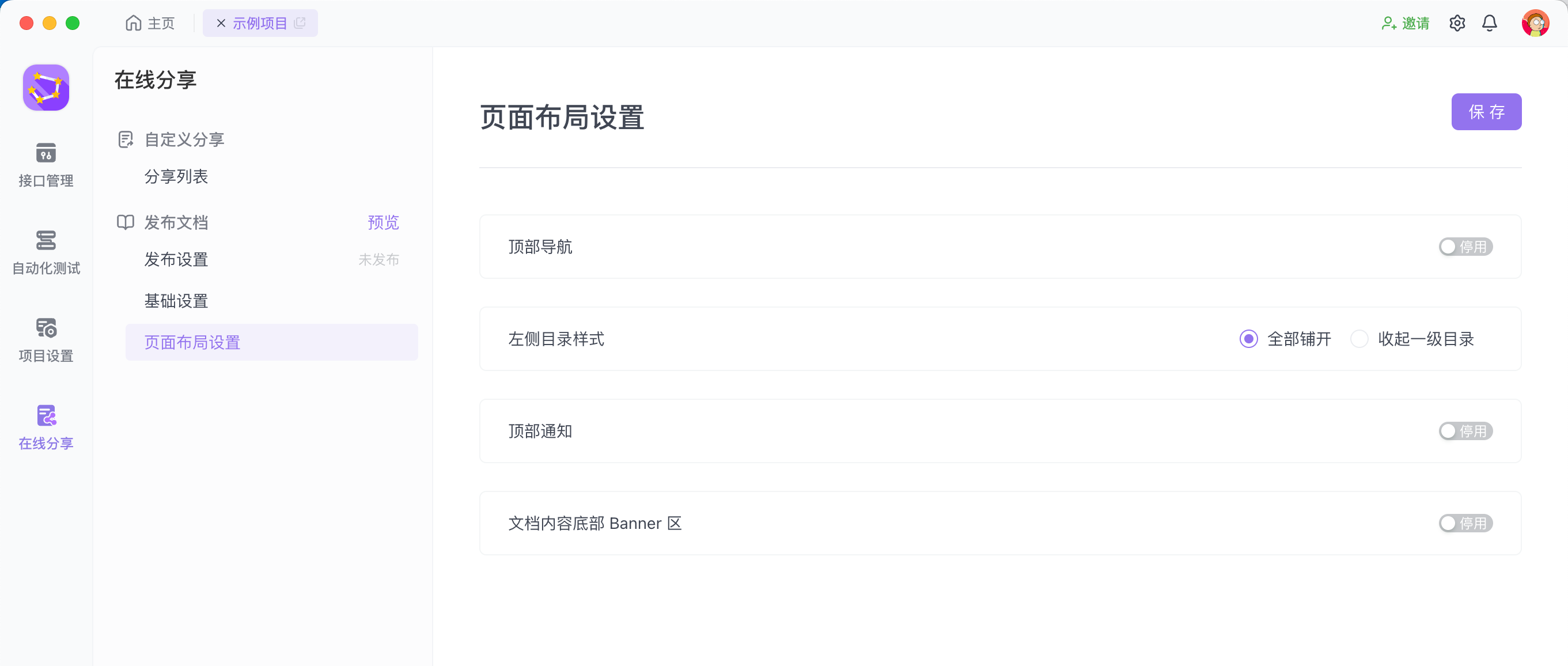 点击左侧“在线分享”菜单,进入页面布局设置页面进行调整。支持在模块中添加各种组件,分别是:顶部导航、左侧目录样式、顶部通知、文档内容底部 Banner 区。