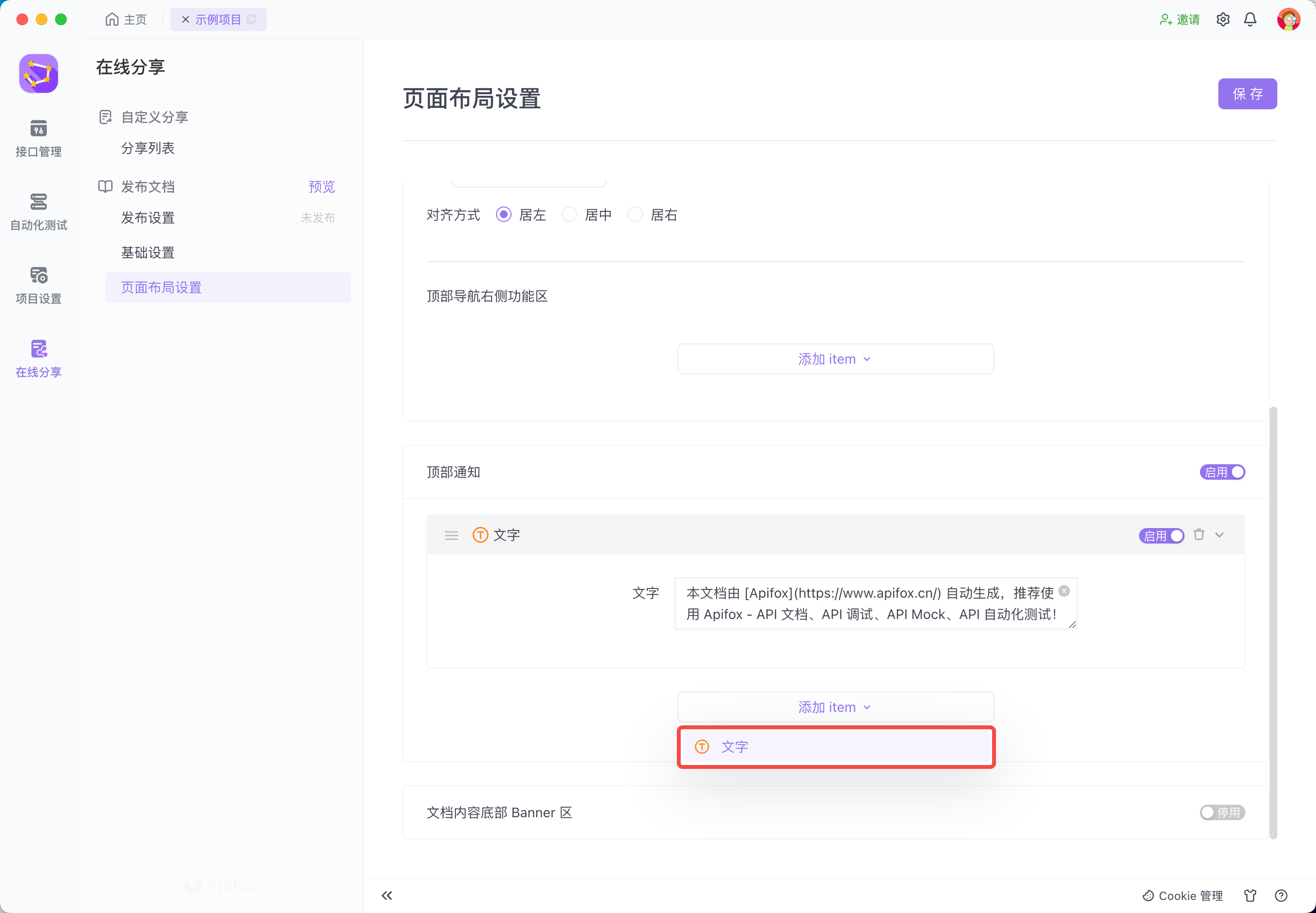 页面布局设置功能允许用户自定义 API 在线文档页,包括:添加导航功能,添加文档底部 banner,添加登录注册按钮等。