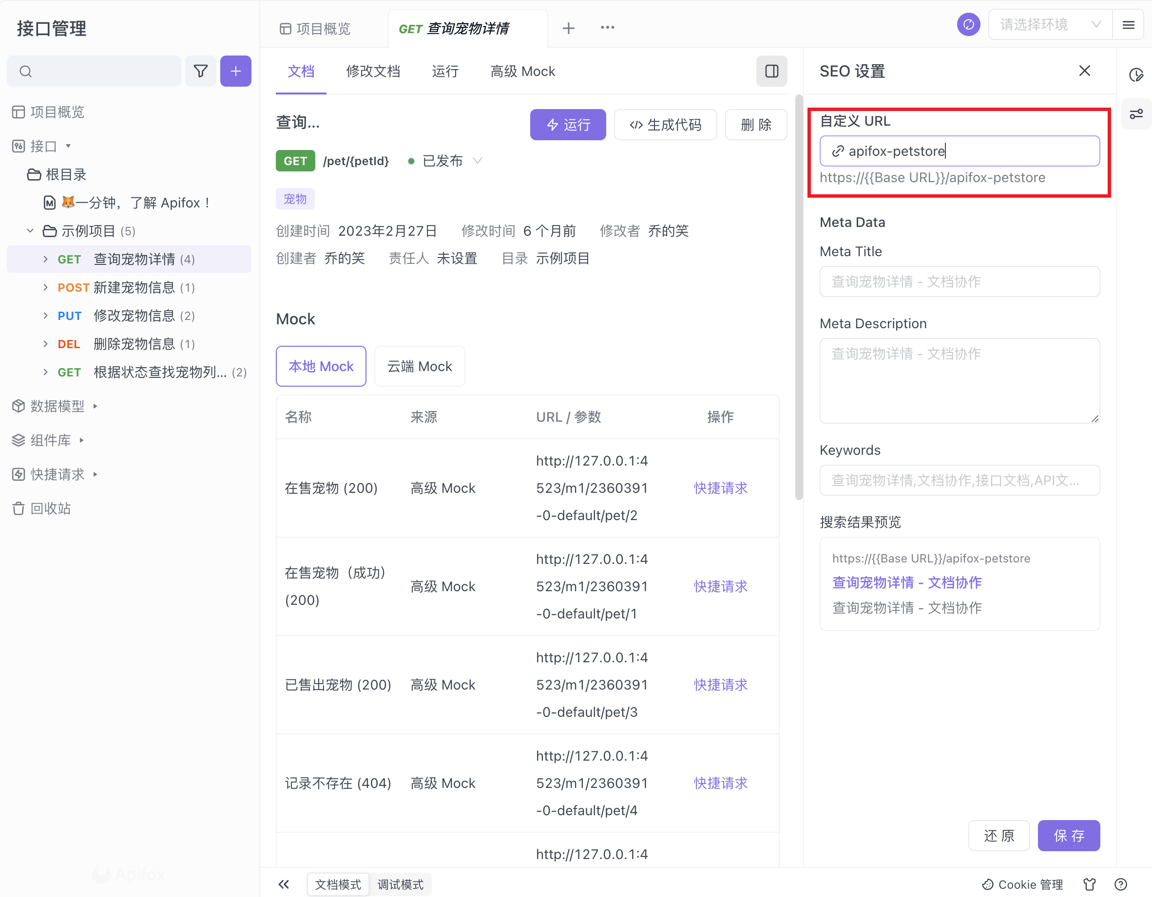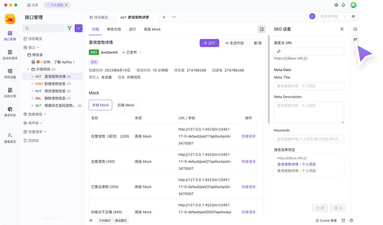 Apifox 为 API 文档提供了 SEO 设置功能,你可以针对搜索引擎优化 API 文档,吸引更多的浏览量。