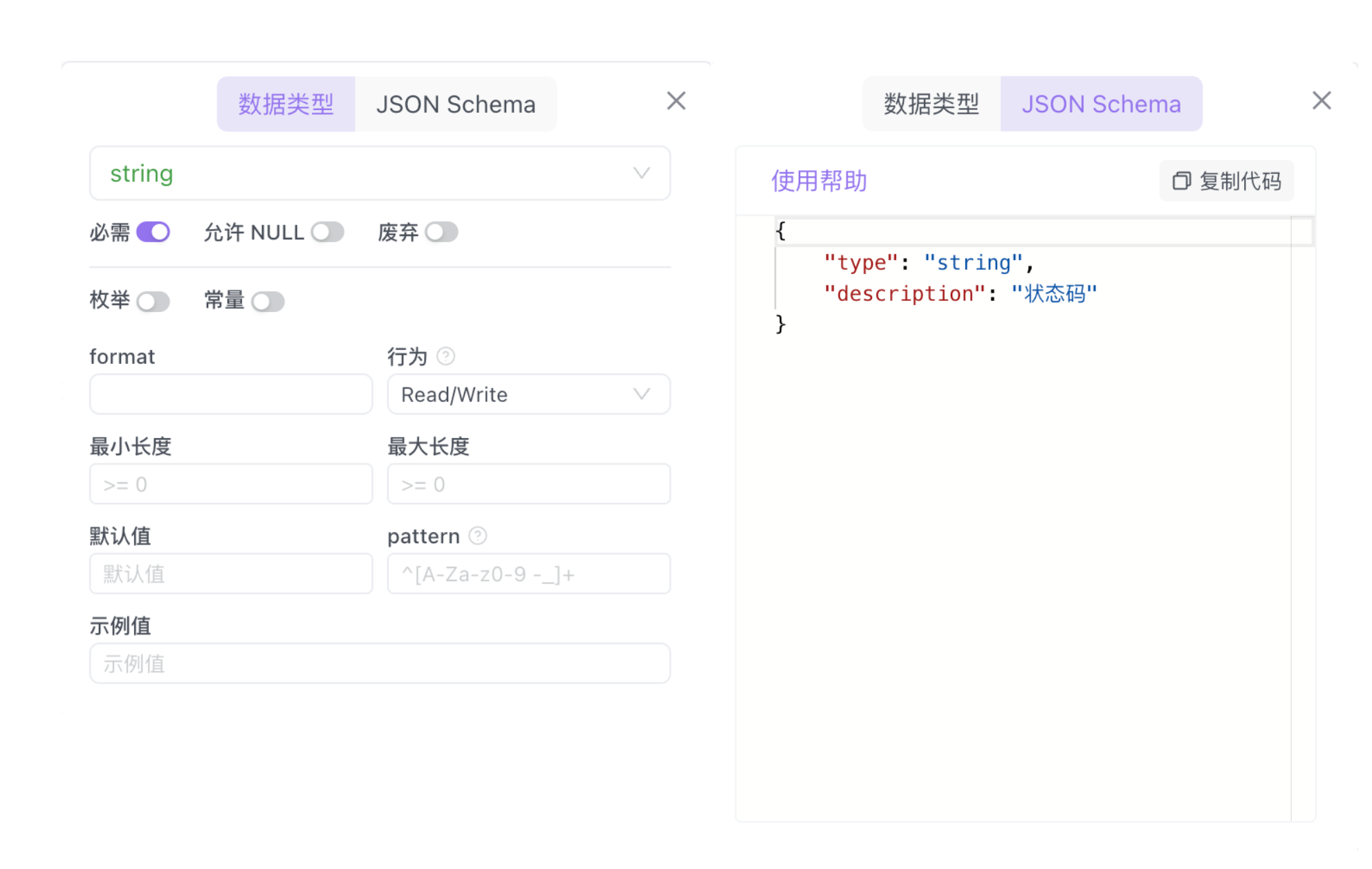 在”高级设置“页中支持设置数据字段的长度范围、枚举值、Partten、format 等,这些设置可以作为 Mock 规则进行使用。