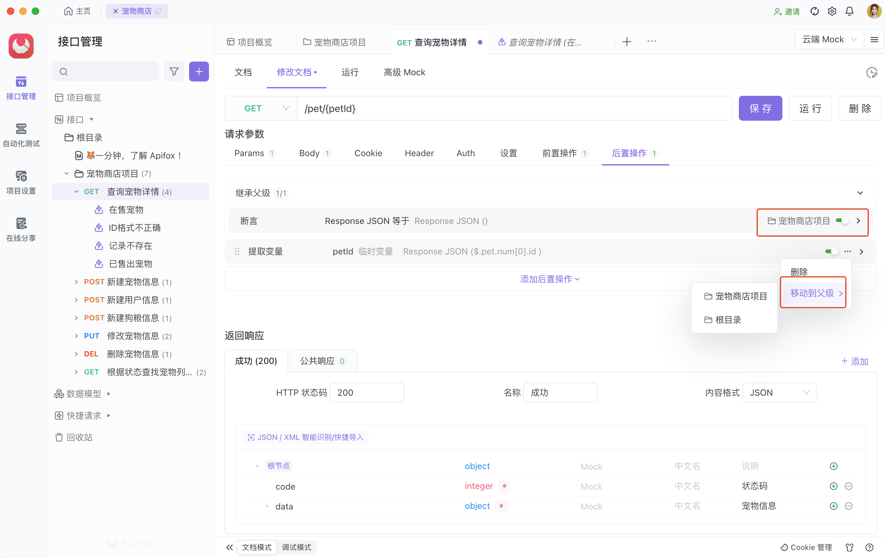 - 单个接口/接口用例默认继承父级的前/后置操作,可关闭继承;单个接口/接口用例的前/后置操作支持移动到父级分组维度。