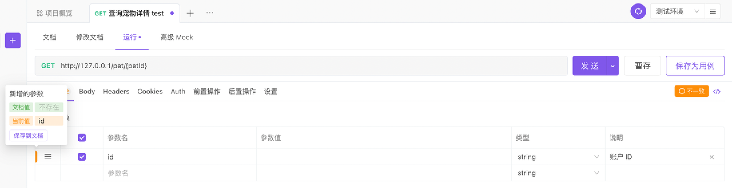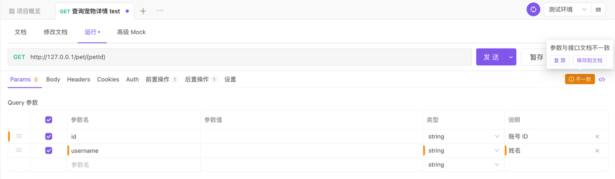 复原或保存到文档时,可以看到请求参数右上角有不一致文字,鼠标移动上去,根据需要选择。