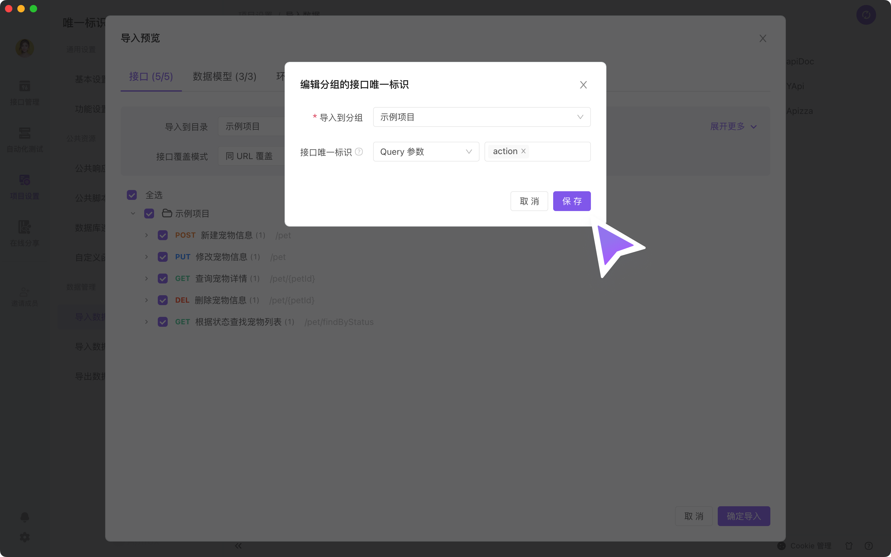 举例:某一个电商 API 接口,以 Query 参数 的参数 action ,作为 接口唯一标识 的参数。如下页面,导入 Apifox 时,点击编辑 修改 接口唯一标识。