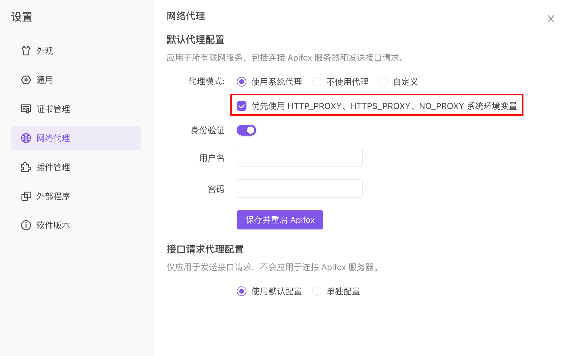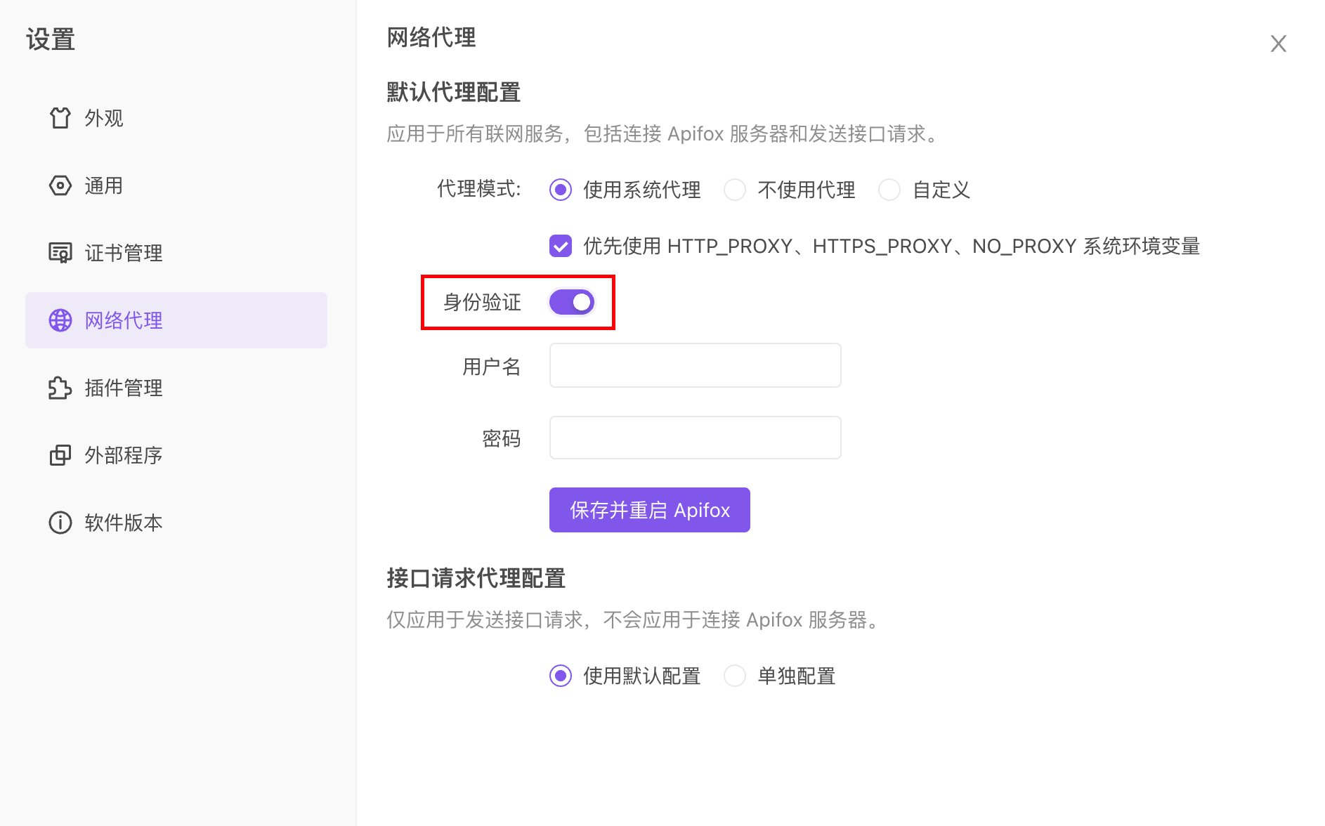 如果你的系统配置的代理服务器需要身份验证,请在 Apifox 中输入身份信息。在左下角的 设置-网络代理 中,在 默认代理配置 下的 系统代理自定义,打开 身份验证,输入代理服务器需要的 用户名密码 ,然后选择 保存并重启 Apifox
