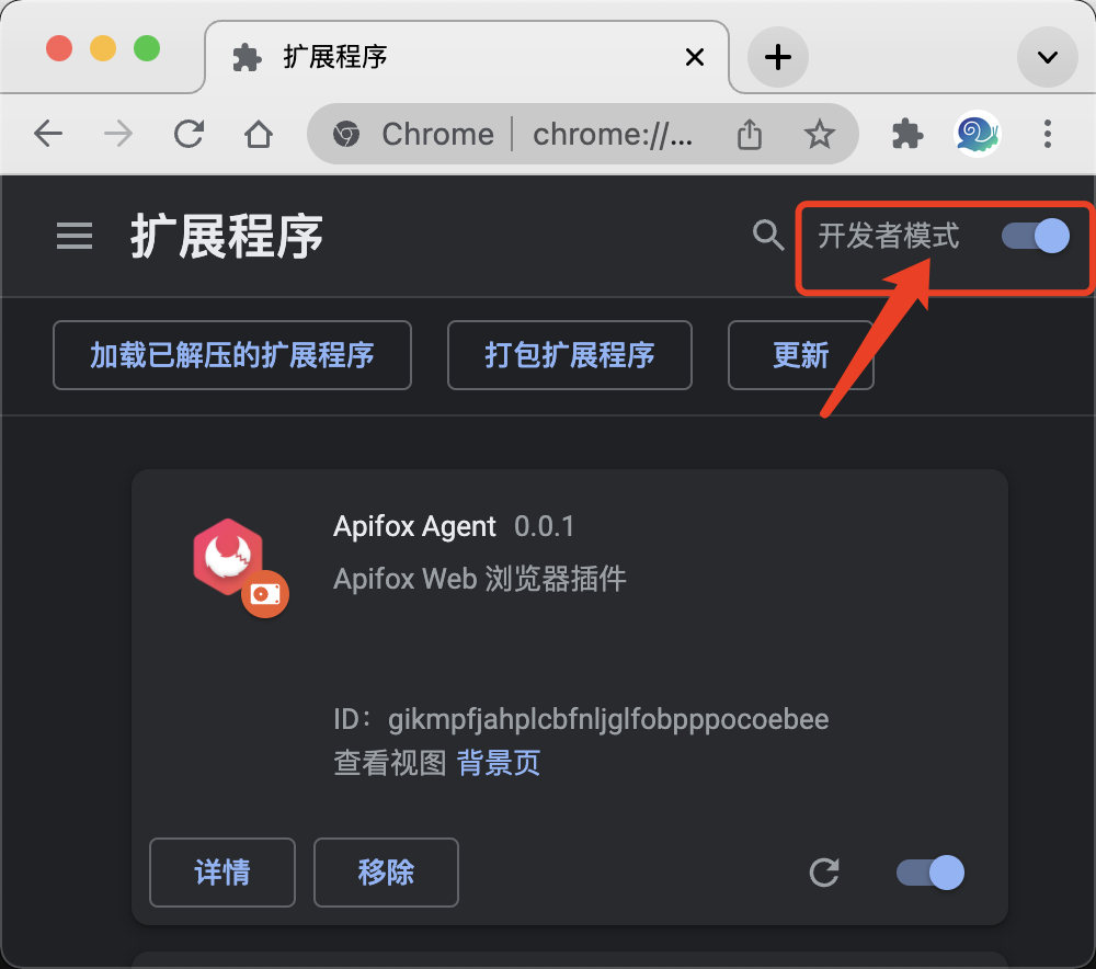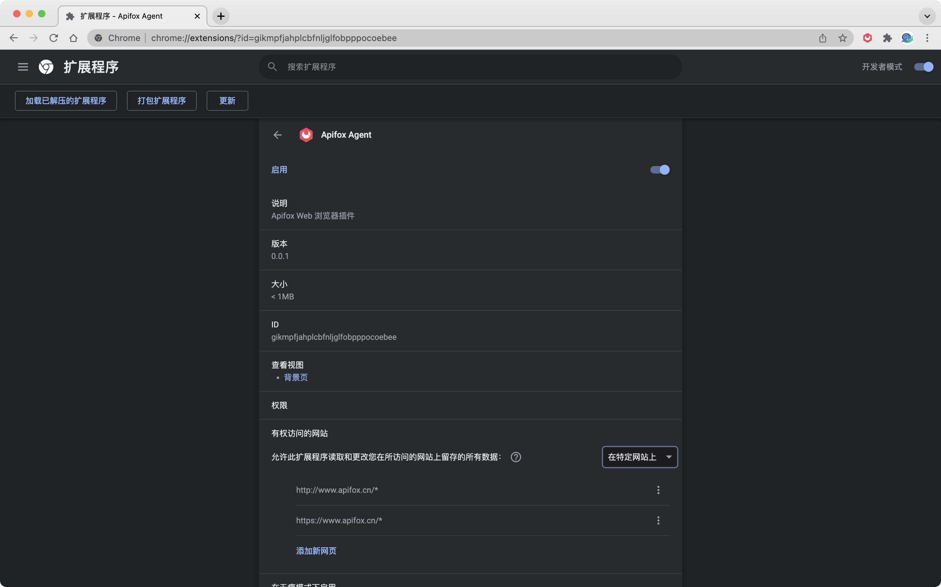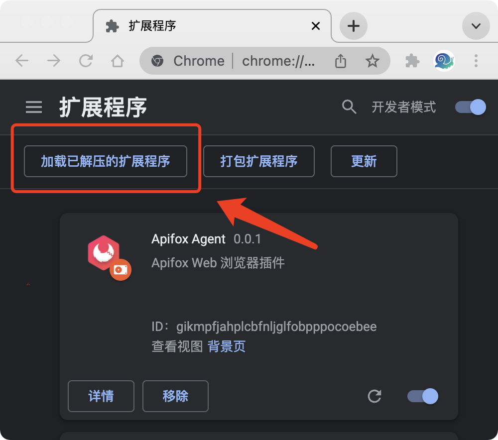 - 然后点击加载已解压的扩展程序,加载后需要刷新访问中的 Apifox Web 网页,Agent 才能生效
