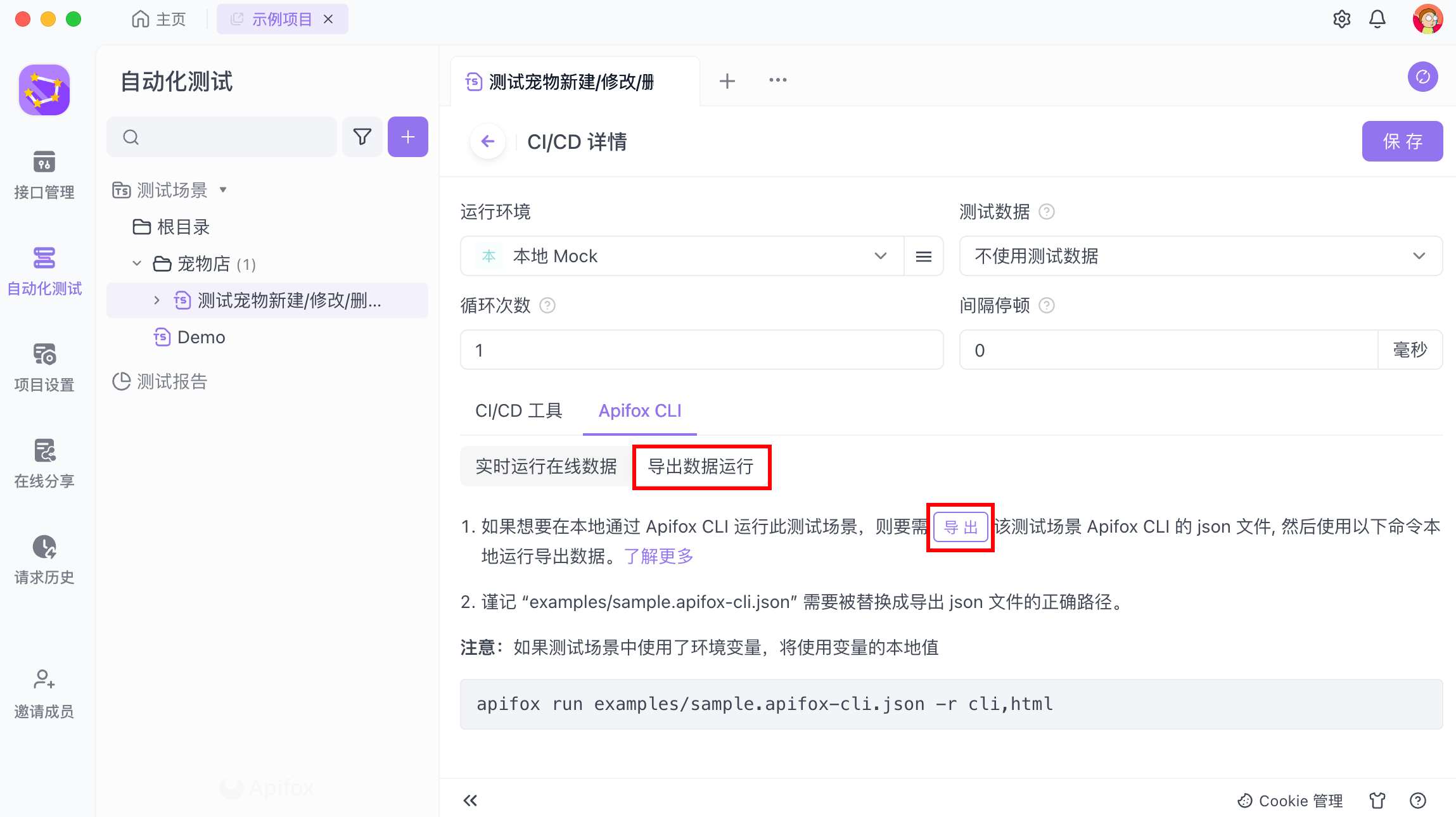 若希望在本地环境中通过 Apifox CLI 运行此测试场景,那么需要先「导出」当前测试场景下的 Json 文件,然后通过 Apifox CLI 工具运行该文件。