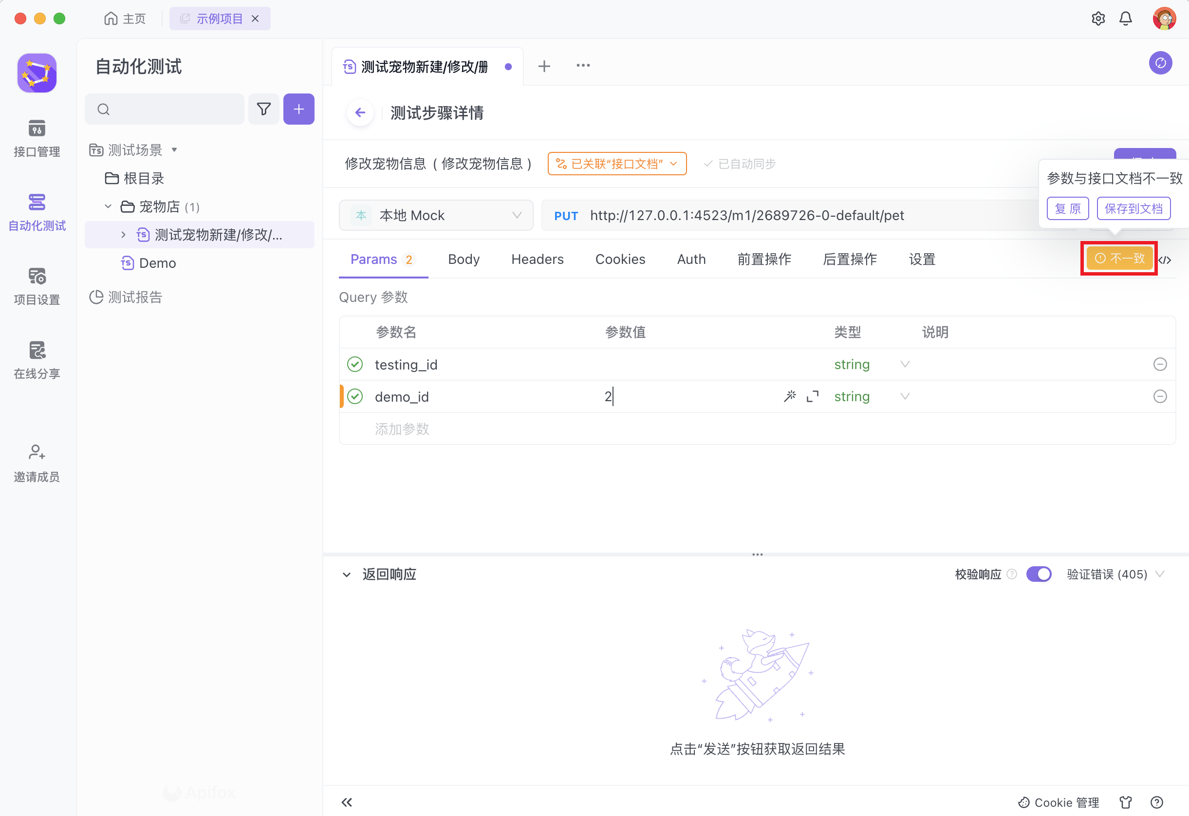 在自动同步模式下,测试步骤内的数据与接口文档的数据的不一致会被高亮呈现出来,测试人员可以选择「复原」来保持跟接口文档完全一致;也可以选择「保存到文档」,此时测试步骤内的数据将反向覆写回接口文档,使得两者保持一致。