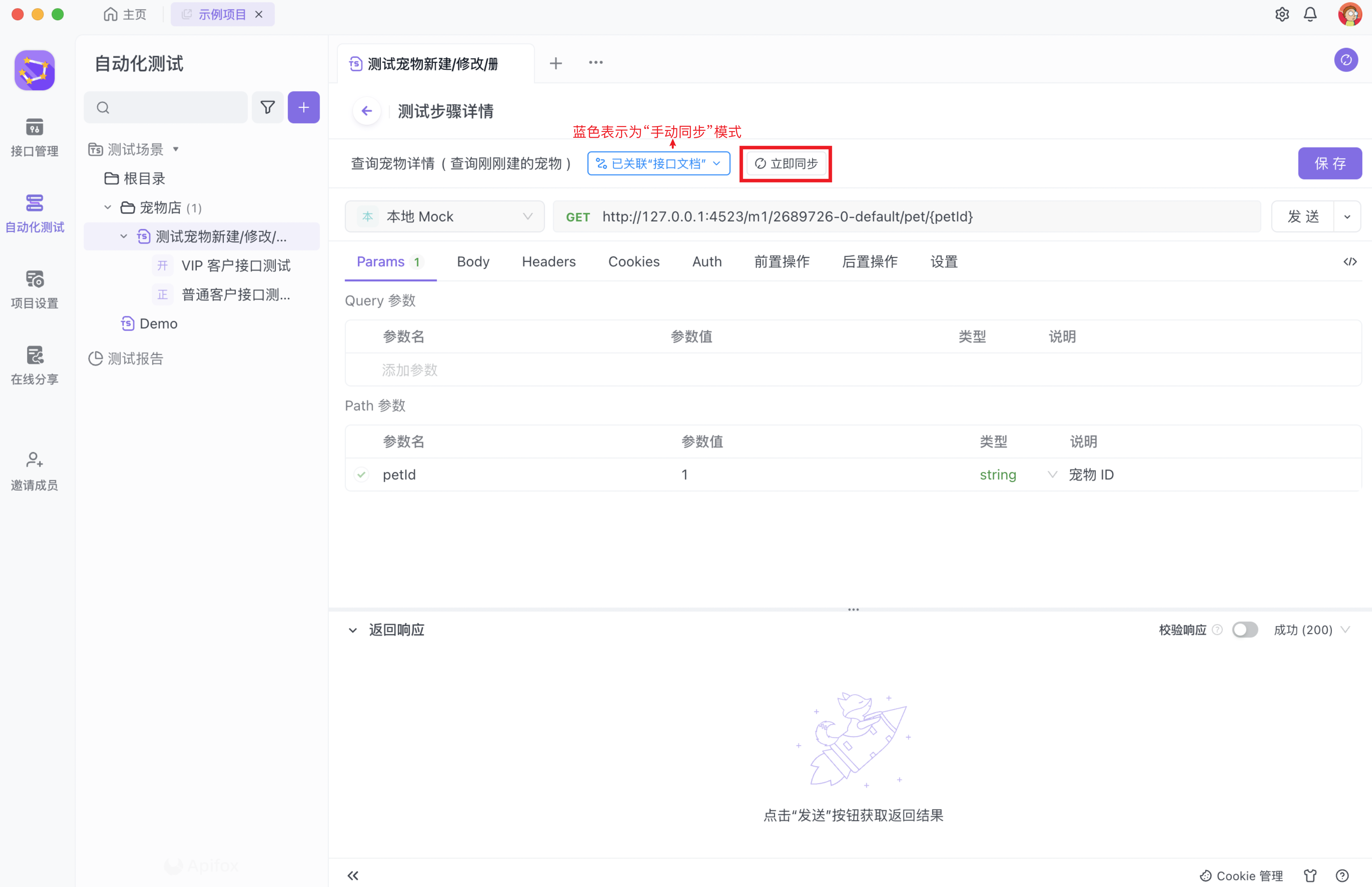 选择手动同步模式,关联按钮将显示为“蓝色”。当「接口管理」中的接口文档有任何改动时,测试步骤中的数据不会实时同步改动内容。测试人员可以在「测试步骤」详情中手动点击「立即同步」按钮将接口文档/用例改动同步至此。
