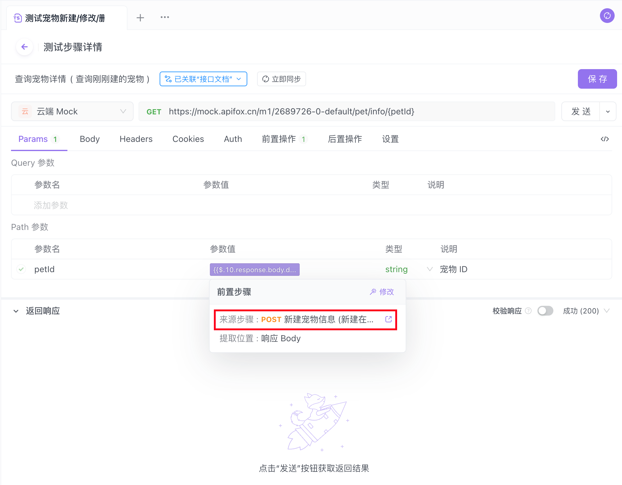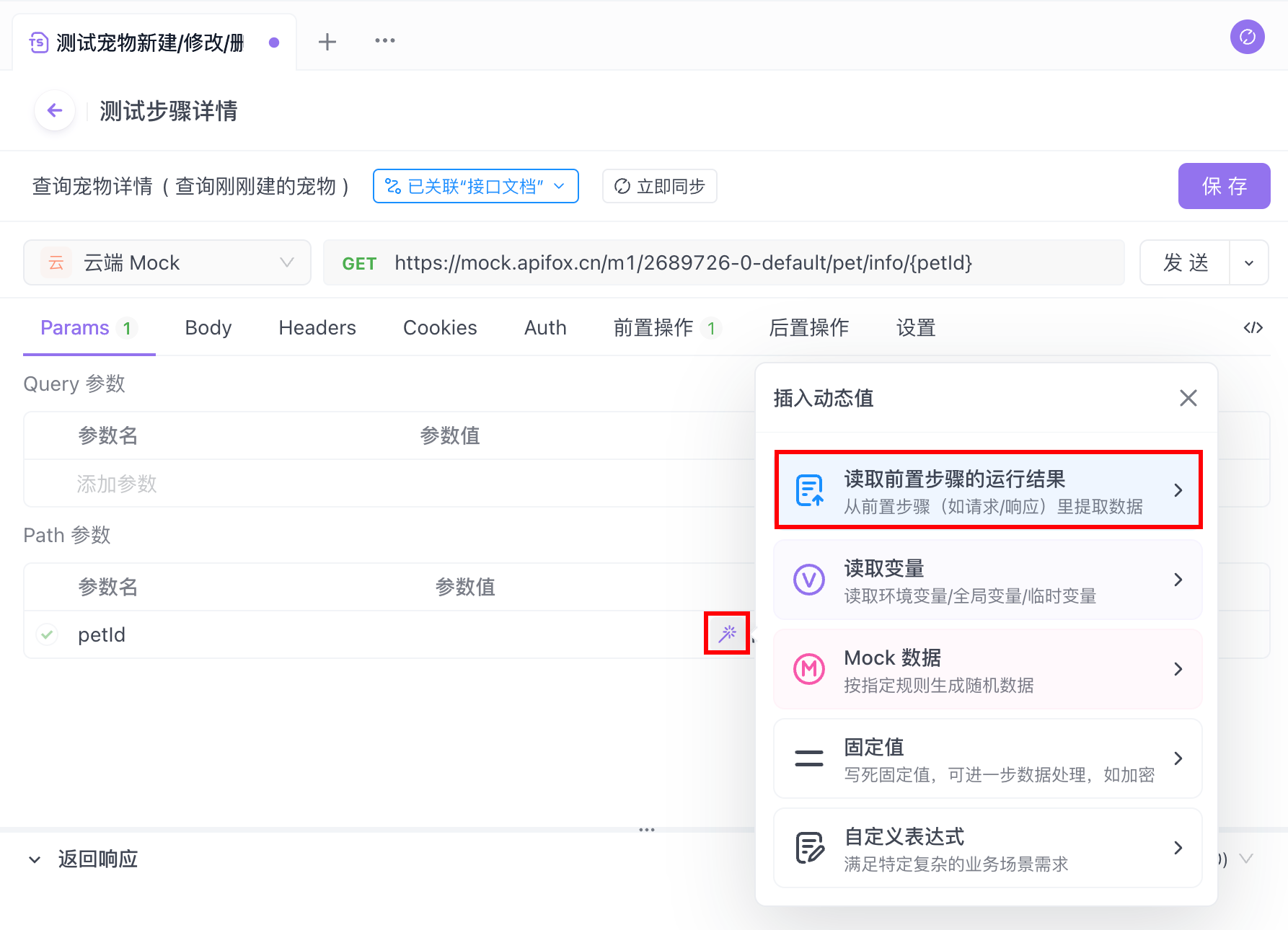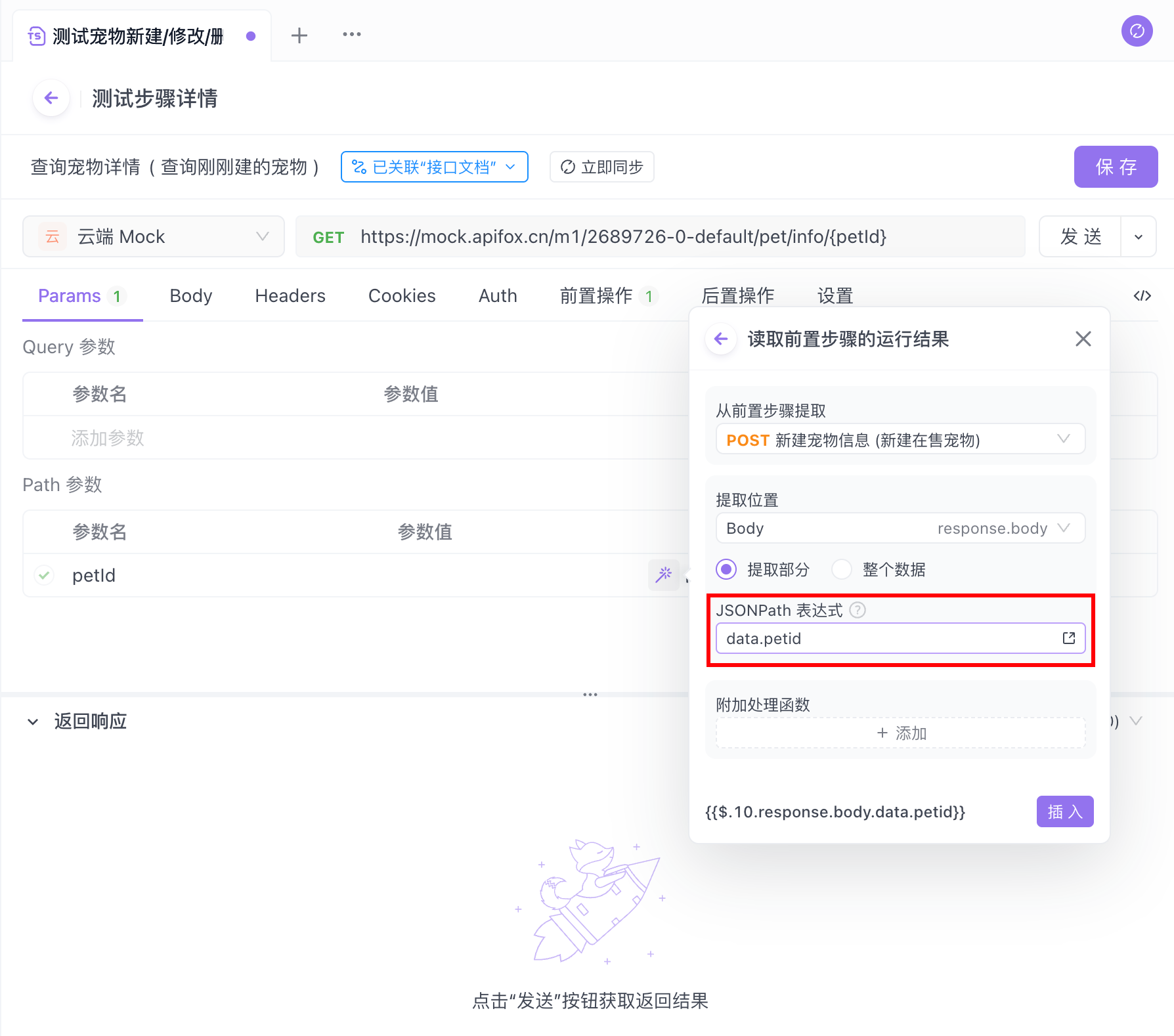 在 B 接口 的 JSONPath 表达式中填写 data.petId 后点击“插入”。你可以查看 JSONPath 语法了解更多复杂的数据提取方法。