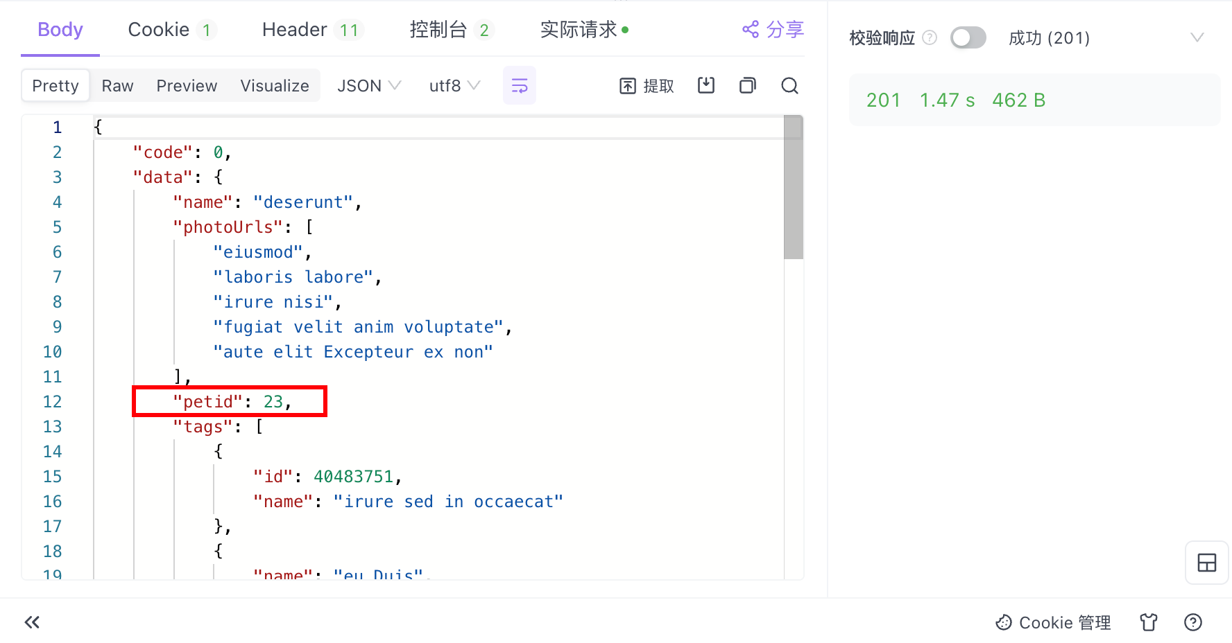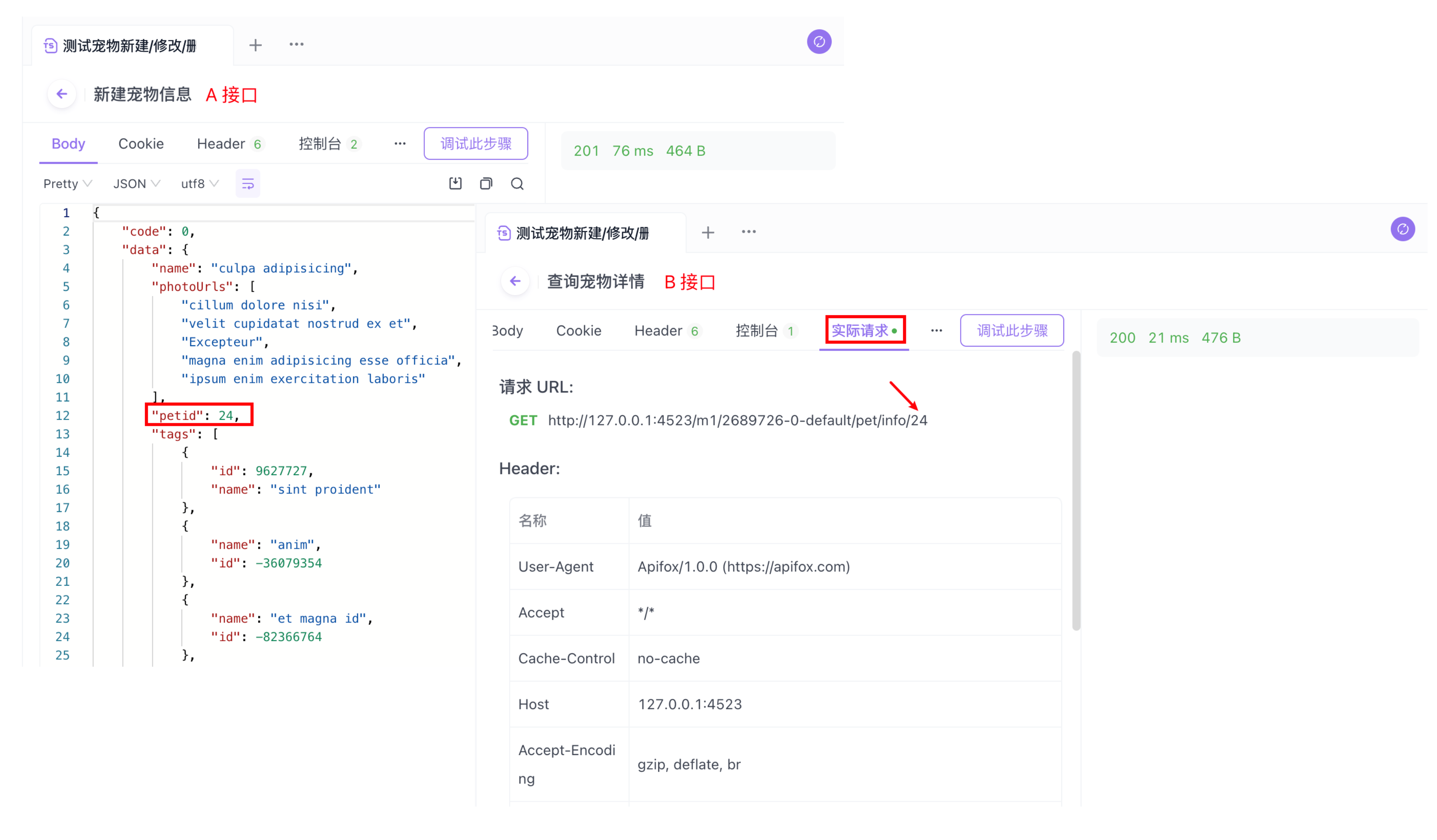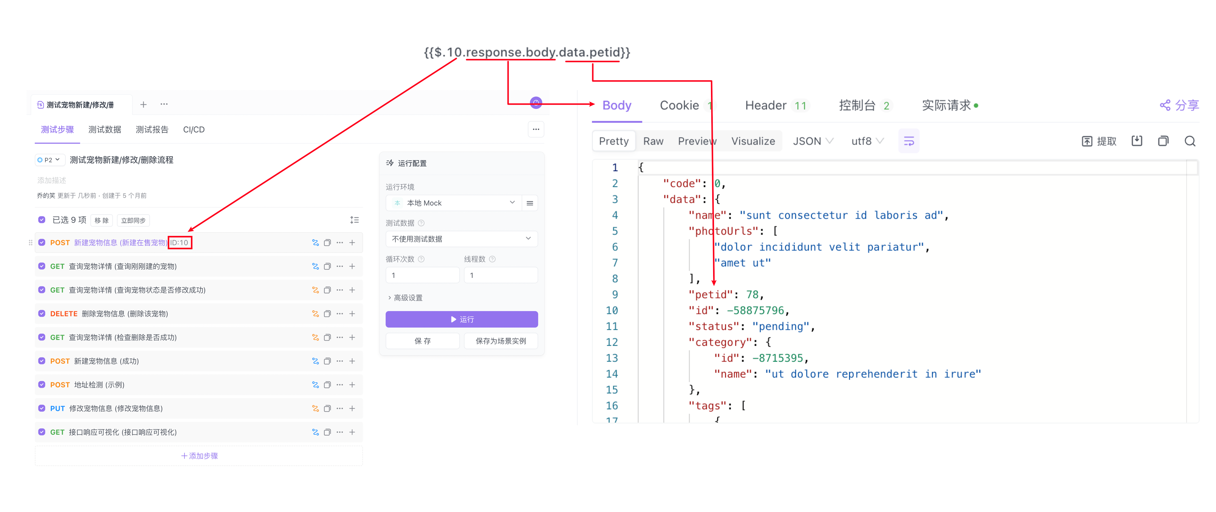 选择从 A 接口 的响应数据 Body 中提取信息,指定“提取部分”数据。可以在 A 接口的请求响应中看到目标 petId 参数值位于 data 列中。