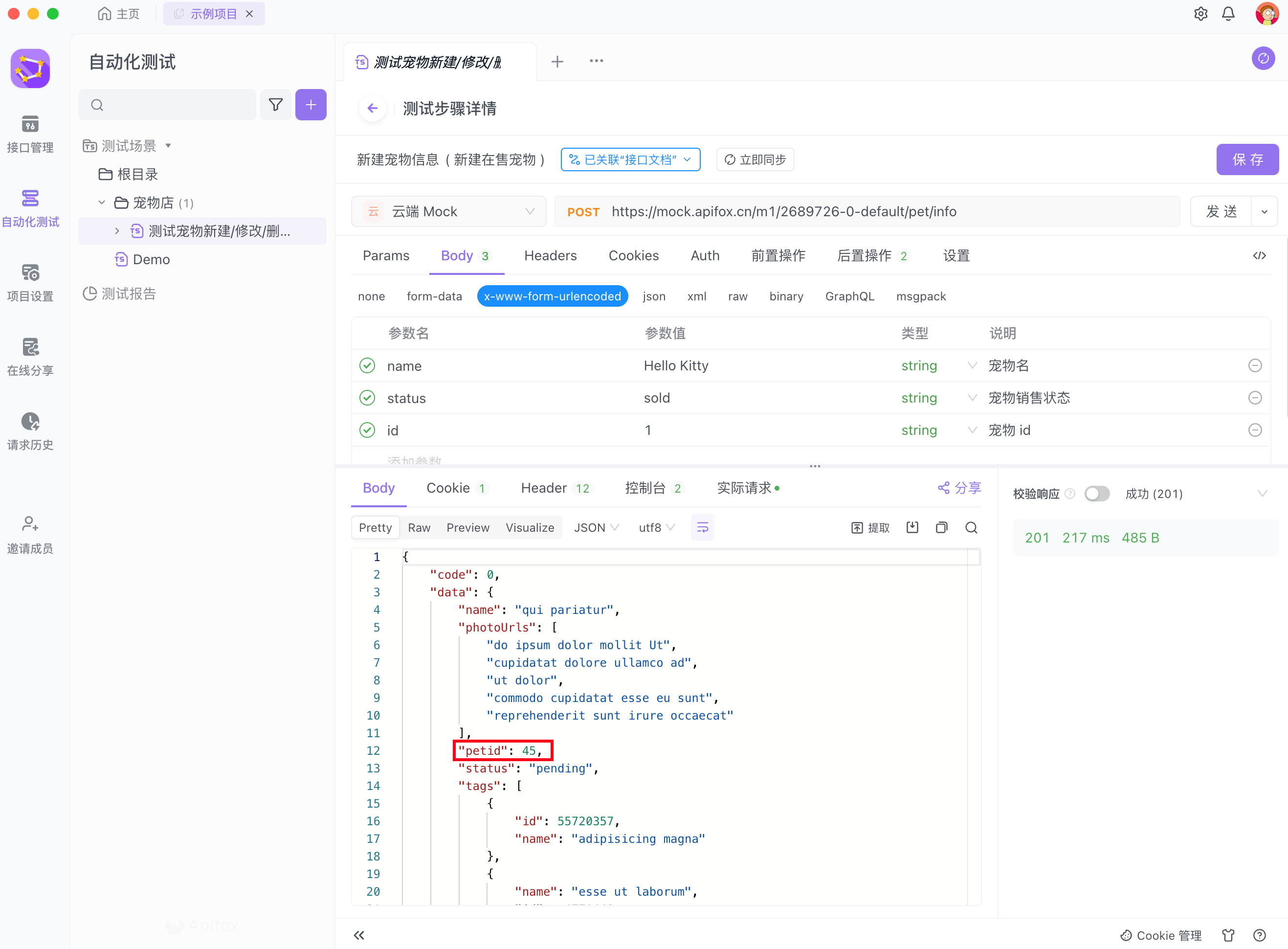 现假设在一个自动化测试计划中,需提取 A 接口返回数据中的 petId 值并作为 B 接口的请求参数。下文将通过两个方法,分别演示如何完成接口间的参数传递和连接过程。