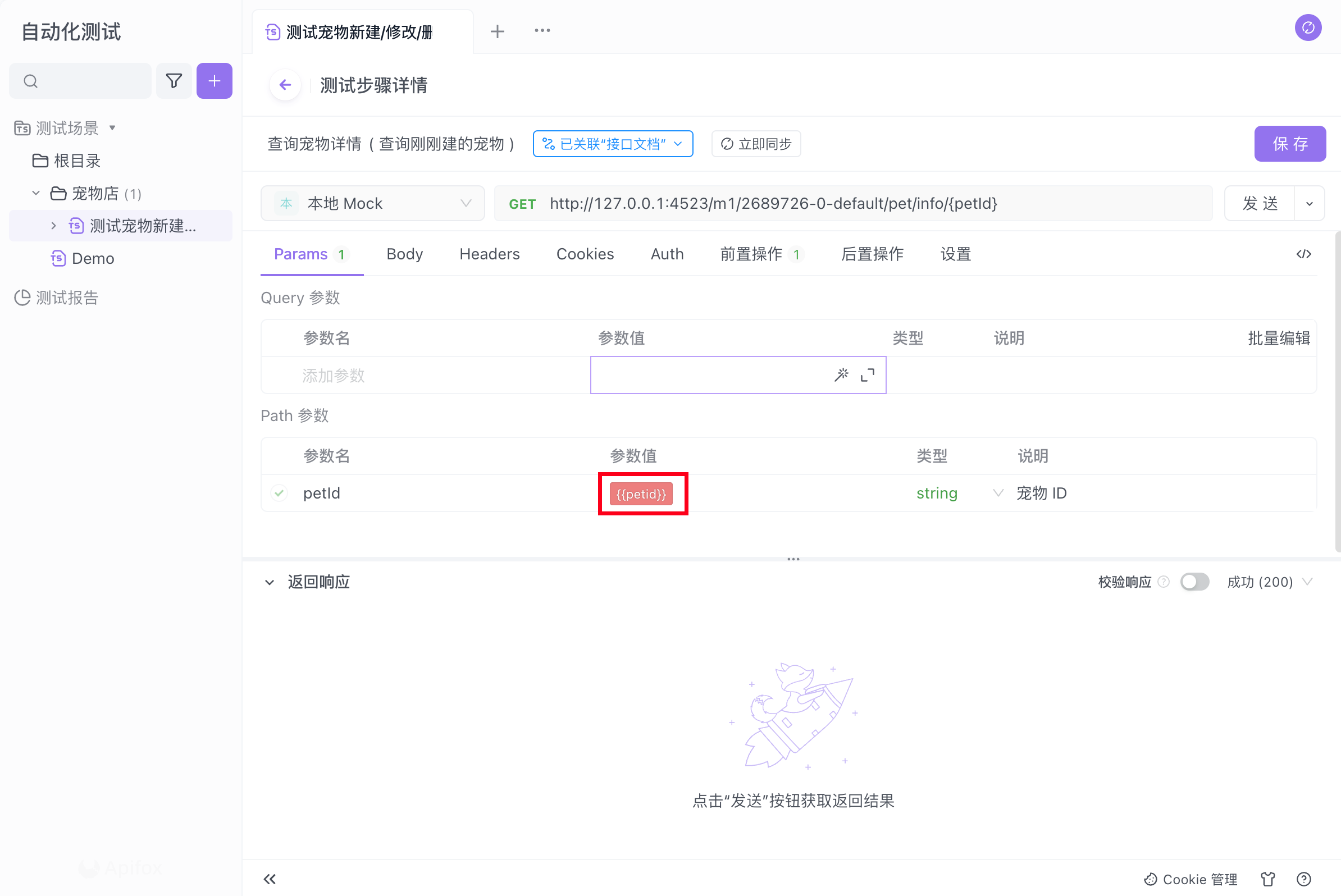 在 B 接口中的请求参数中直接填写 {{petId}},即可在请求参数中直接引用 A 接口所返回的值。