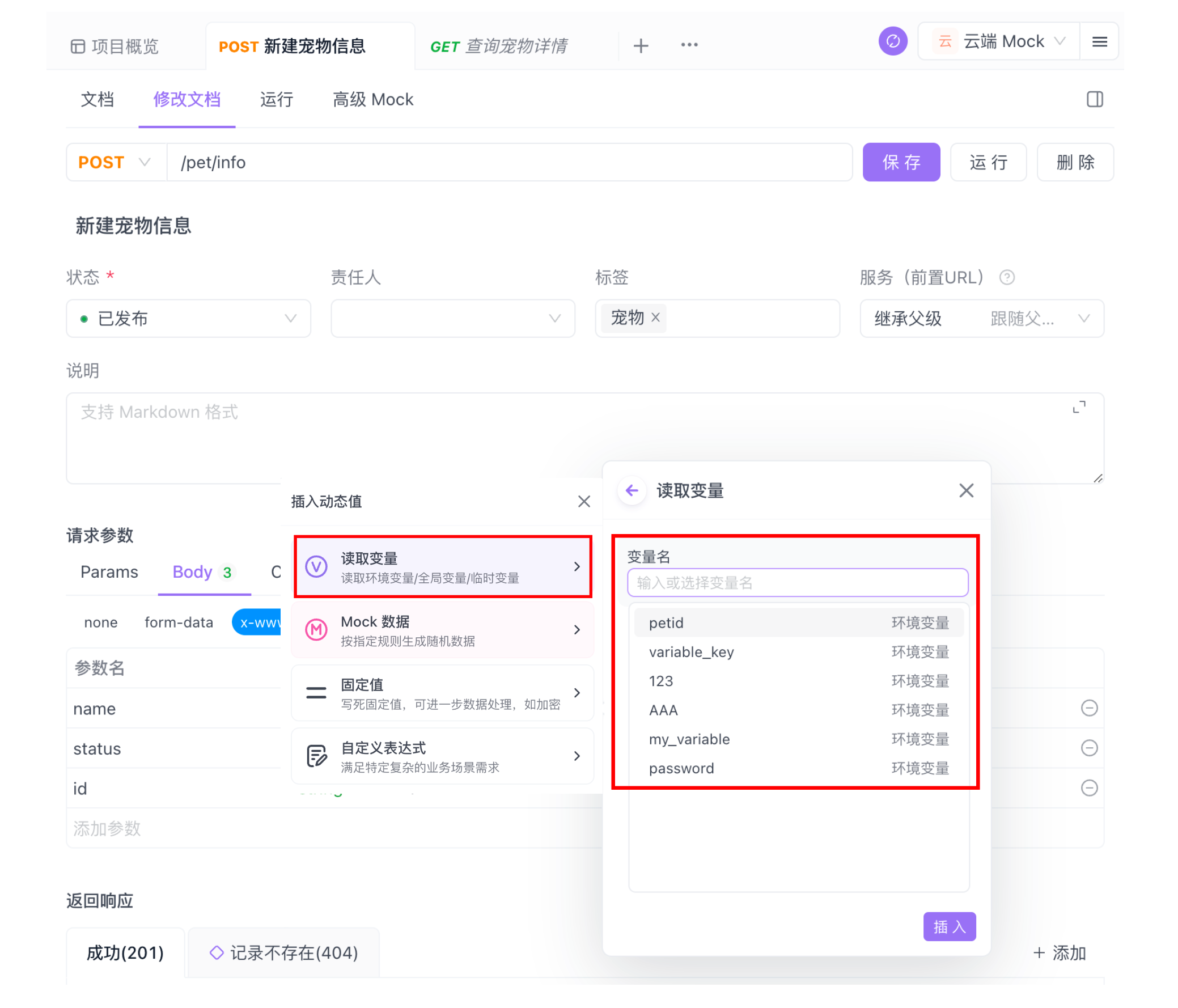 支持引用已在当前环境中预设的环境变量与全局变量,也可以额外插入一个新的自定义变量。