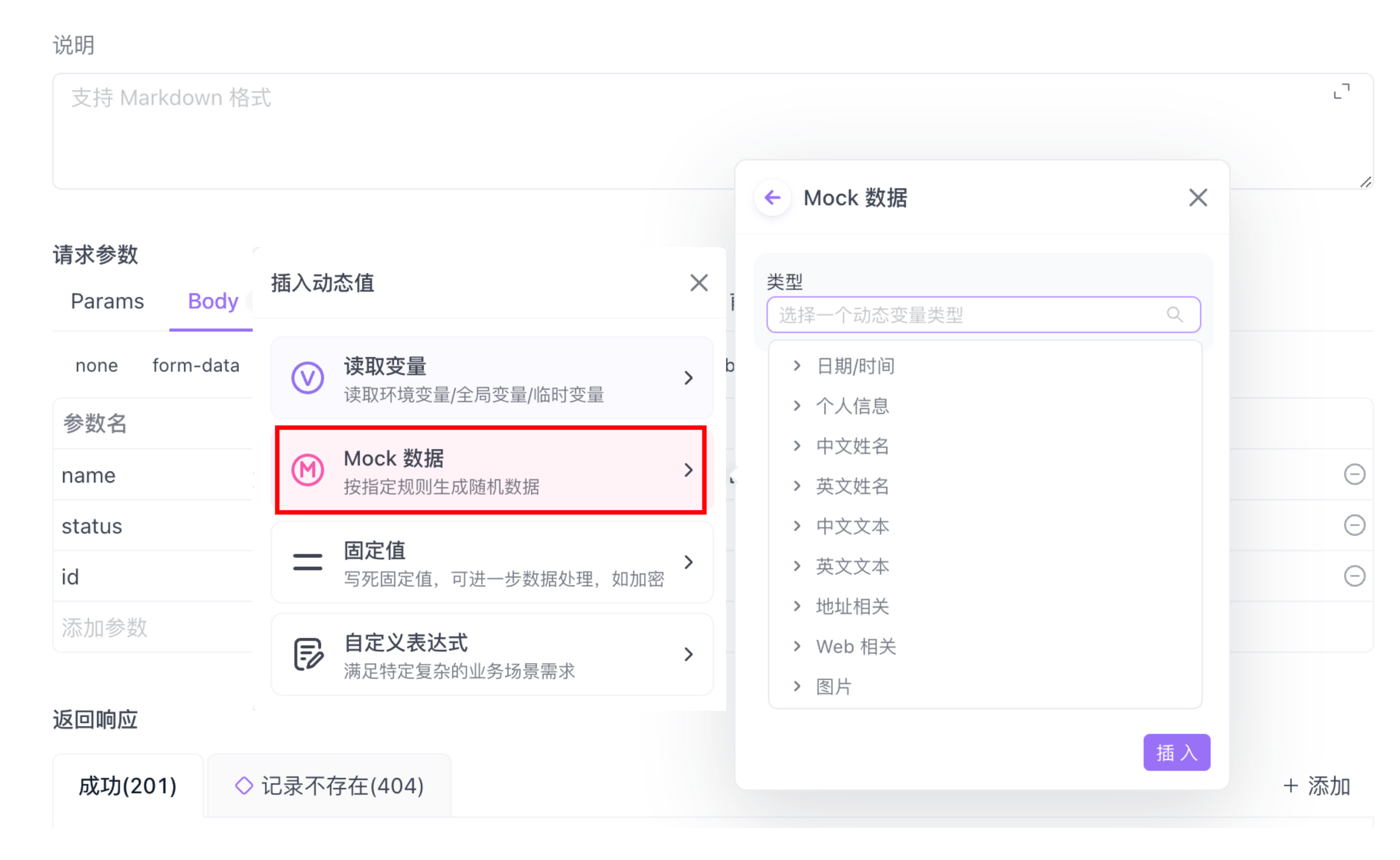如果想要在请求中按照规则随机生成一个随机值,那么可以选择 Mock 数据,例如生成电话、邮箱和地址等。