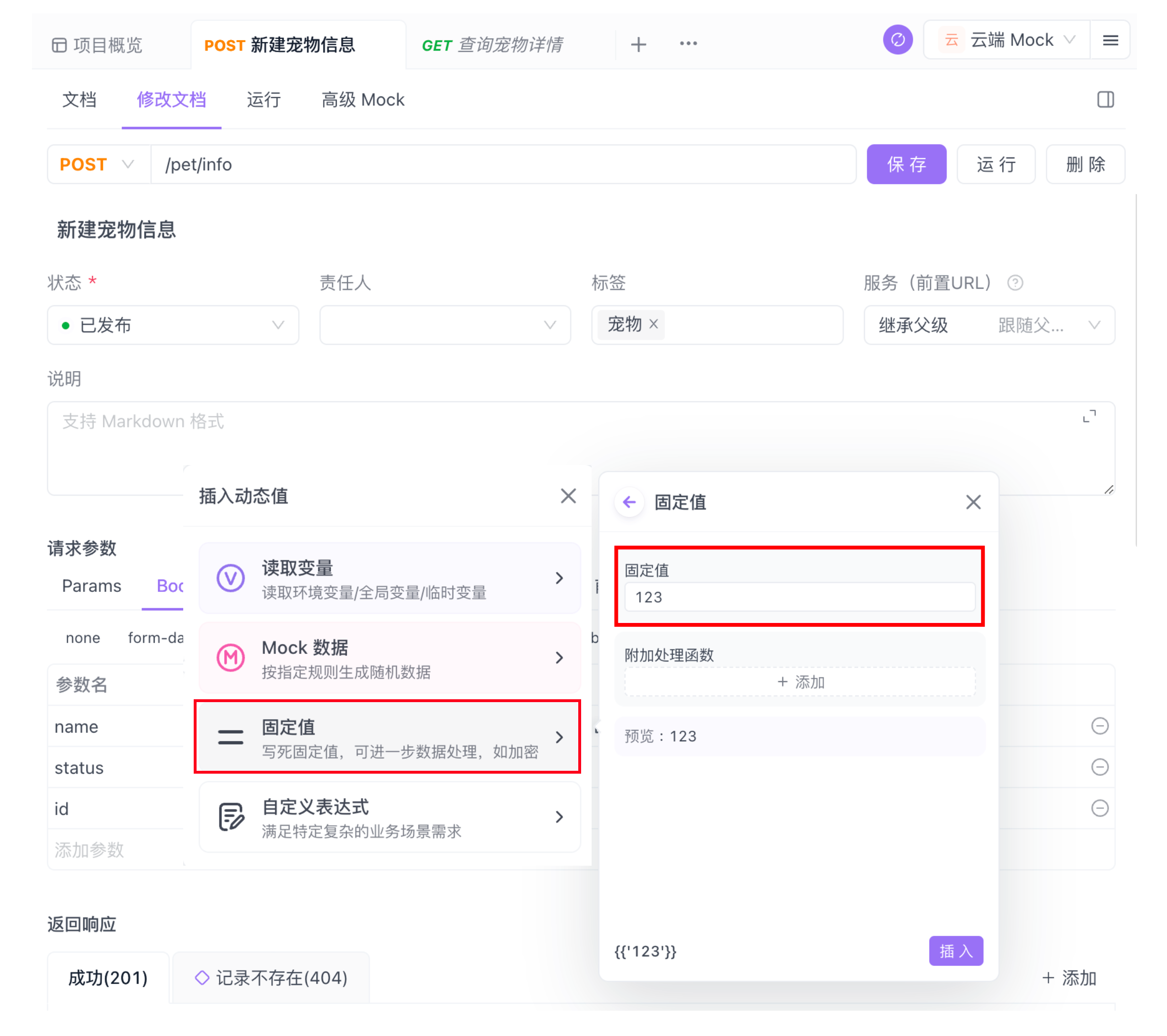 如果希望参数的示例值保持为一个常量,选择固定值后,在输入值处输入固定值。