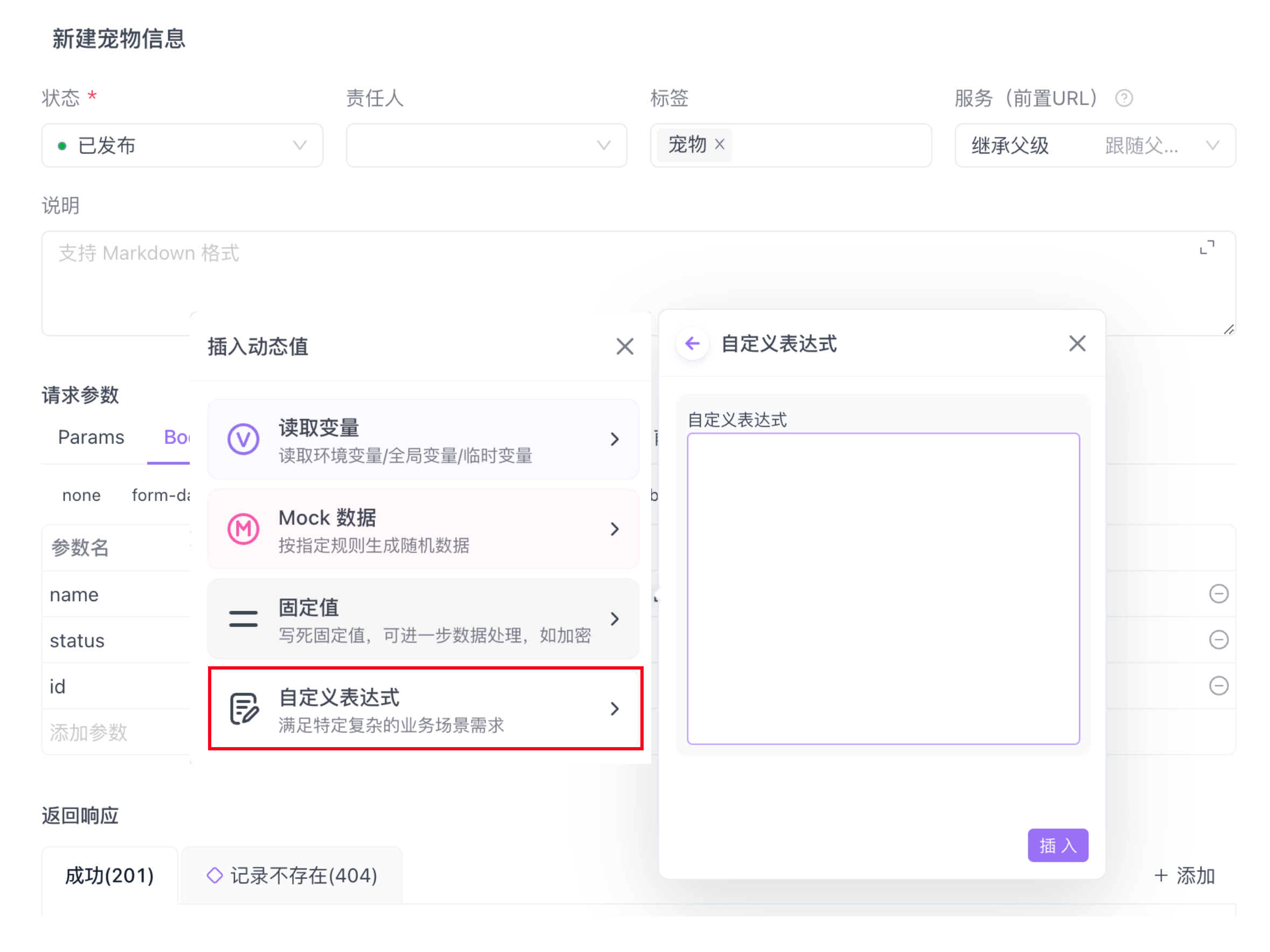 动态值中支持添加读取变量、Mock 数据、固定值与自定义表达式 4 种类型。