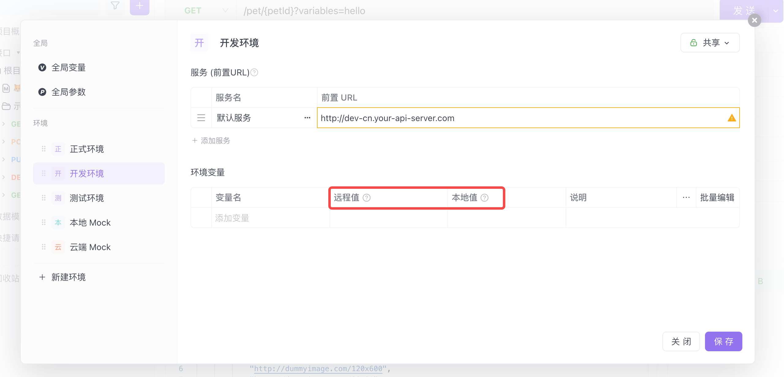 在远程值中填写的数据将保存至远端服务器中,主要用于团队间共享数据值。