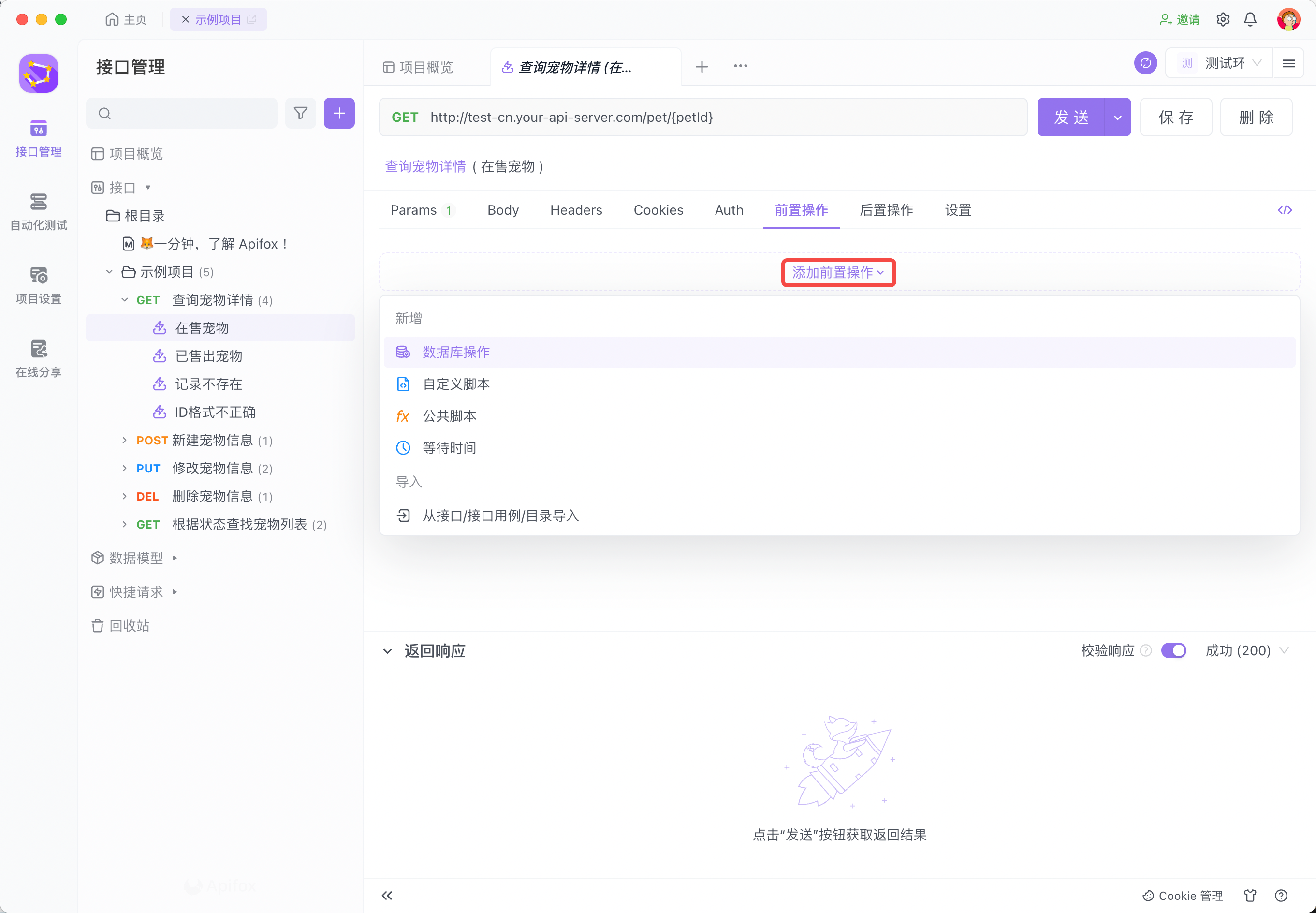 前置脚本是在请求发送前执行的代码片段。例如要在请求头中包含时间戳或在 URL 参数中发送随机的字母、数字、字符串等数据。