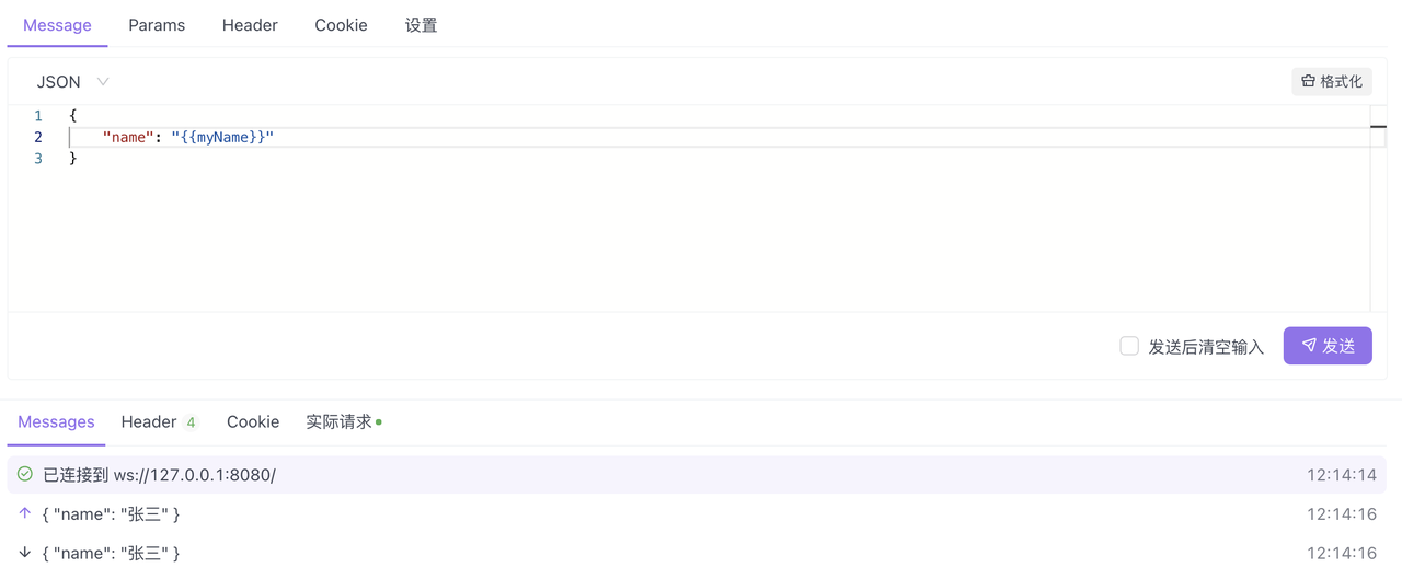 建立 WebSocket 连接后,你可以在 Message 标签下撰写消息。